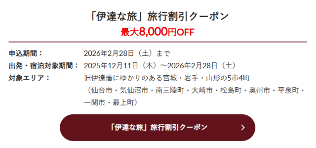 イチオシ情報 Pickupホーム 新着情報 お知らせ ゆったり、じっくり、伊達時間キャンペーン 最大8000円OFF! 2025.12.23ゆったり、じっくり、伊達時間キャンペーン 最大8000円OFF!お知らせイチオシ情報JR東日本さんでは、「往復の列車+エリア内の宿泊プラン」でお使いいただける割引クーポンを配布していますよ。 是非ご利用いただいて、気仙沼へお泊りにお越しください! 当館は仙台駅からは無料のシャトルバスも運行中です! https://www.jre-travel.com/tohoku/#date関連「第11回全国被災地語り部シンポジウムin東北」開催のお知らせ新着情報お知らせイベント情報イチオシ情報「ワタシらしいみやぎの冬旅(ふるさとお得クーポン)」の配布(宮城県のキャンペーン)2025年12月15日 10時頃~新着情報お知らせイチオシ情報伊豆沼はすまつりシャトルバス運行のご案内(8/18~8/24)新着情報イベント情報イチオシ情報夏休み!気仙沼市内の海水浴情報!お知らせイチオシ情報【かつお漁伝来350周年記念特別企画】厳選気仙沼素材とパン業界のレジェンド志賀勝栄氏の競演マリアージュ新着情報お知らせイベント情報イチオシ情報今年の気仙沼は「かつお溜め釣り漁伝来350周年」となる記念の年!お知らせイベント情報イチオシ情報前の記事一覧に戻る次の記事